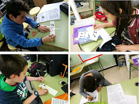 Hoy hemos estado haciendo un taller de escritura japonesa. Es un poco complicado, pero como Pierre nos escribió nuestros nombres en japonés solo hemos tenido que copiarlos. Algunos hemos utilizado rotuladores, otros pinceles, unos con tinta, otros con pintura... Este ha sido el resultado.